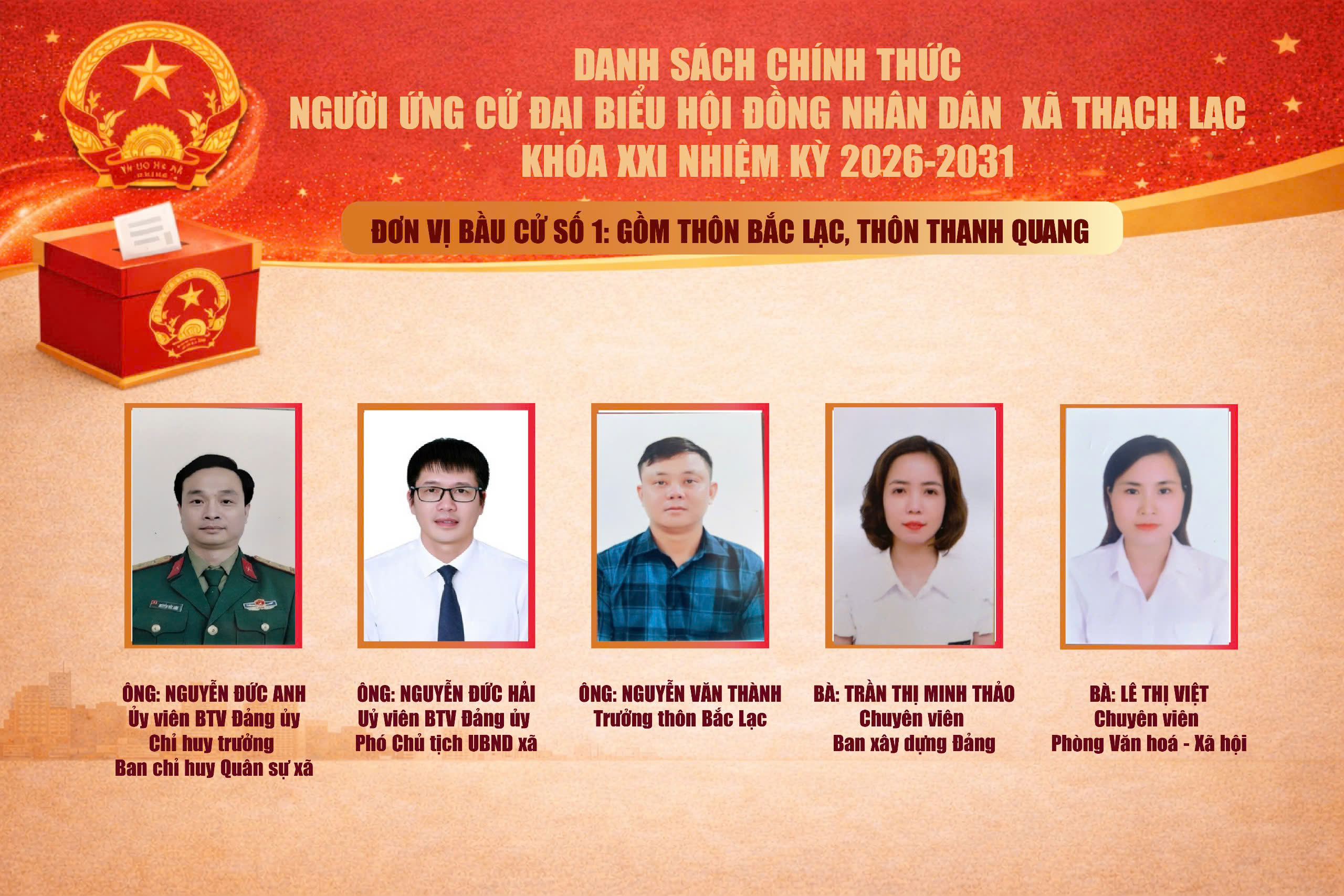 1. Ông Nguyễn Đức Anh, sinh năm 1984; quê quán xã Tùng Lộc, tỉnh Hà Tĩnh; hiện ở phường Thành Sen, tỉnh Hà Tĩnh; trình độ chuyên môn Đại học Chỉ huy tham mưu binh chủng hợp thành; lý luận chính trị Trung cấp; hiện là Chỉ huy trưởng Ban Chỉ huy Quân sự xã Thạch Lạc.