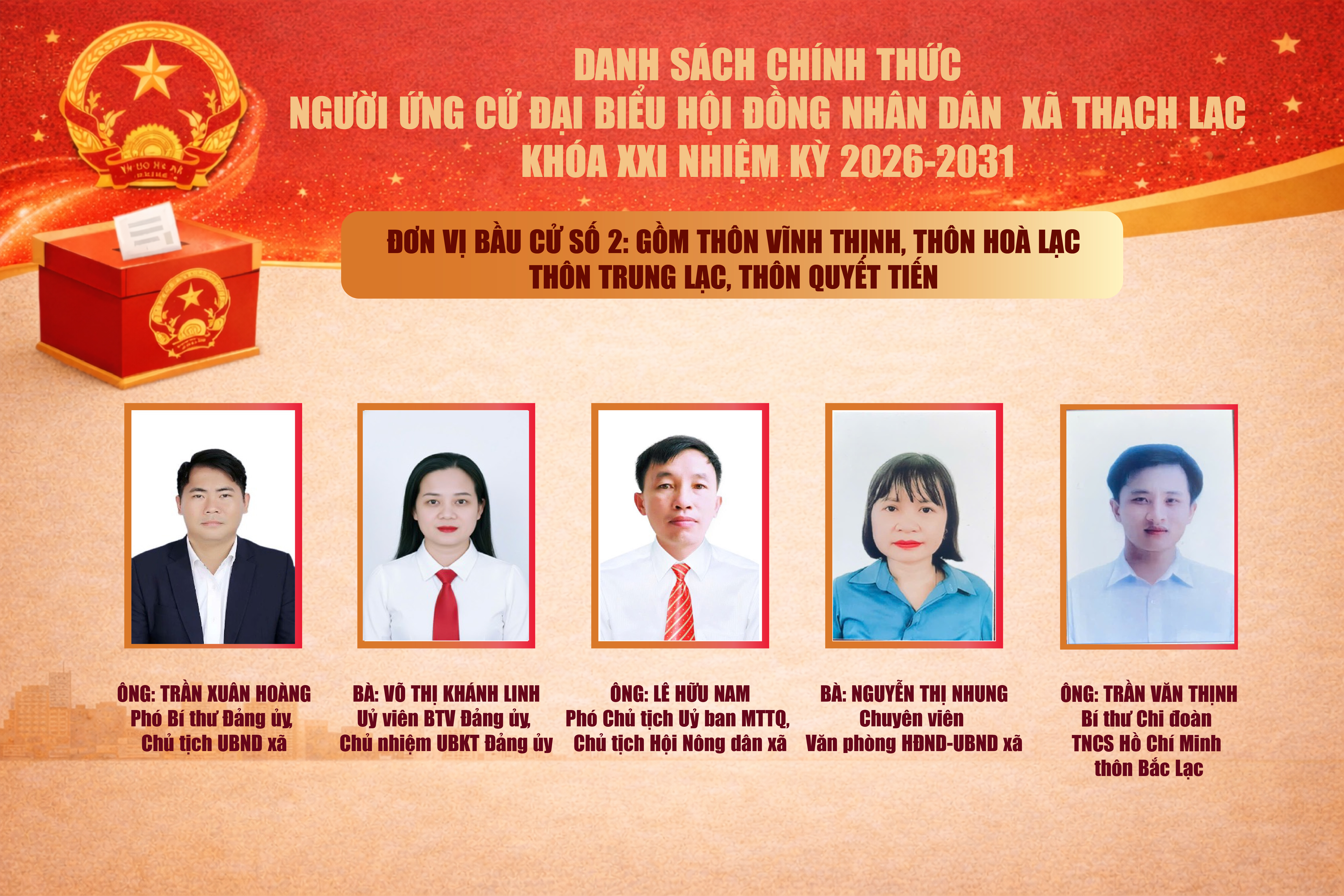1. Ông Trần Xuân Hoàng, sinh năm 1988; quê quán xã Thạch Khê; hiện ở phường Thành Sen; trình độ chuyên môn Thạc sĩ Quản trị kinh doanh; lý luận chính trị Cao cấp; hiện là Phó Bí thư Đảng ủy, Chủ tịch UBND xã Thạch Lạc.
