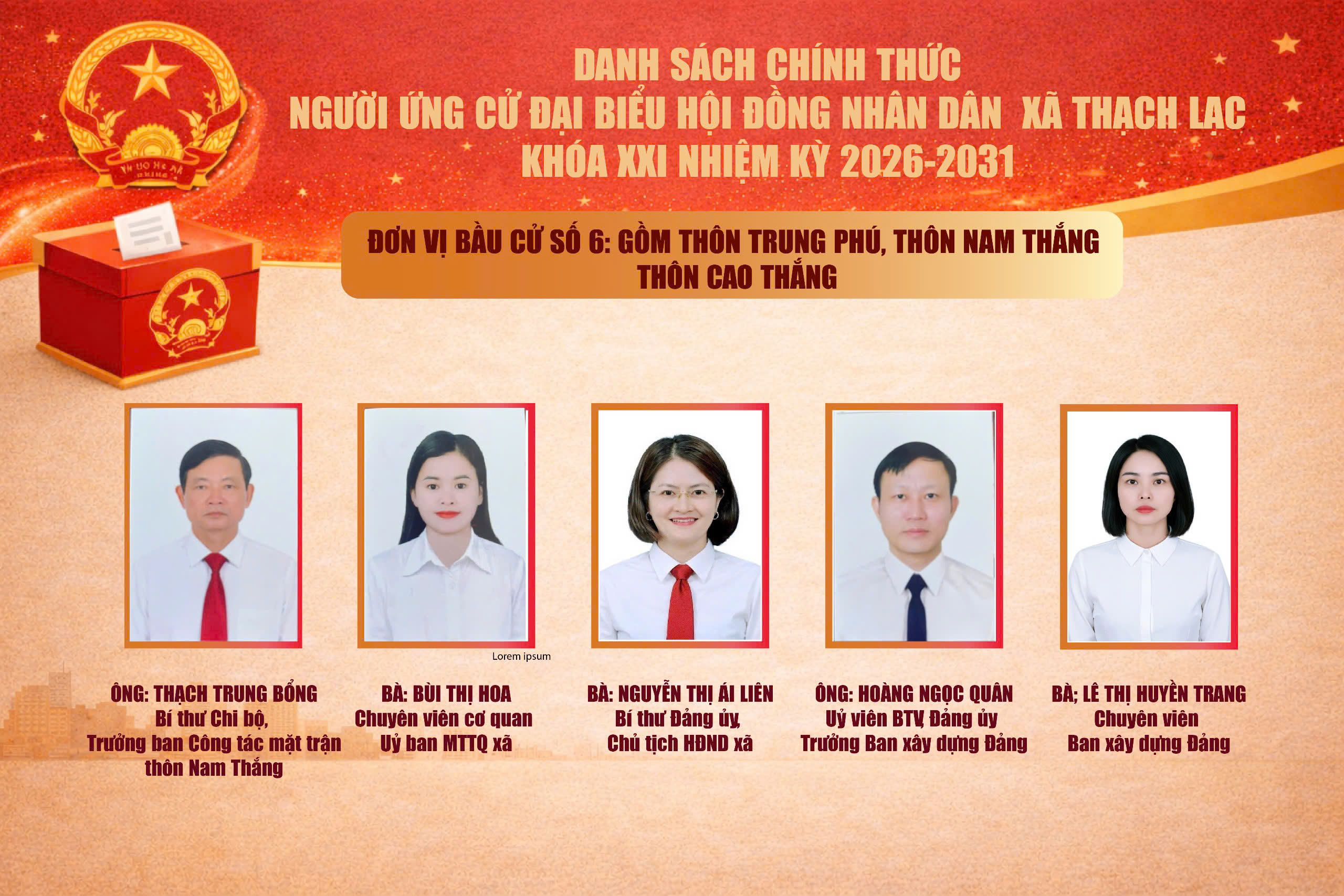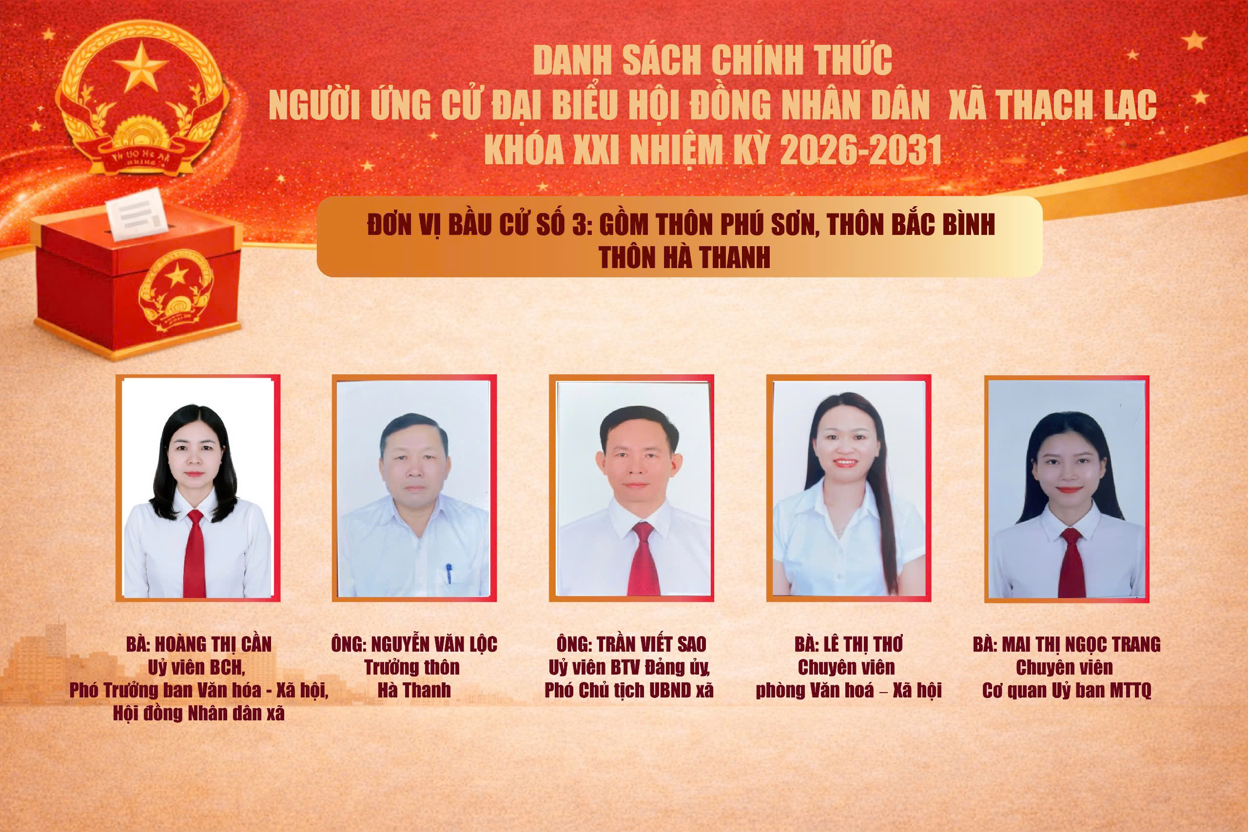 5. Bà Mai Thị Ngọc Trang, sinh năm 1992; quê quán xã Toàn Lưu; hiện ở phường Thành Sen; trình độ chuyên môn Đại học Tài chính; lý luận chính trị Trung cấp; hiện là Chuyên viên Ủy ban MTTQ xã Thạch Lạc.
