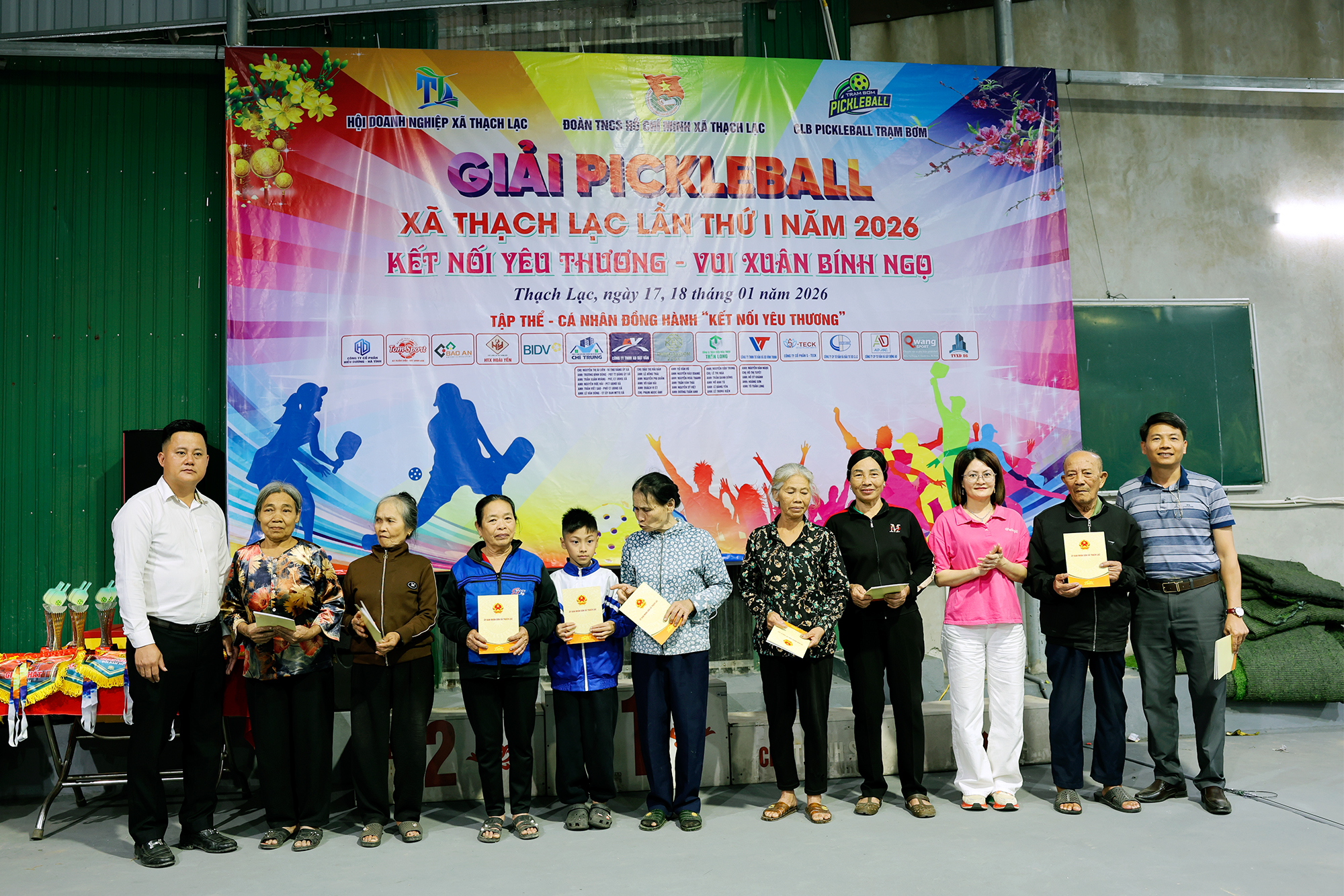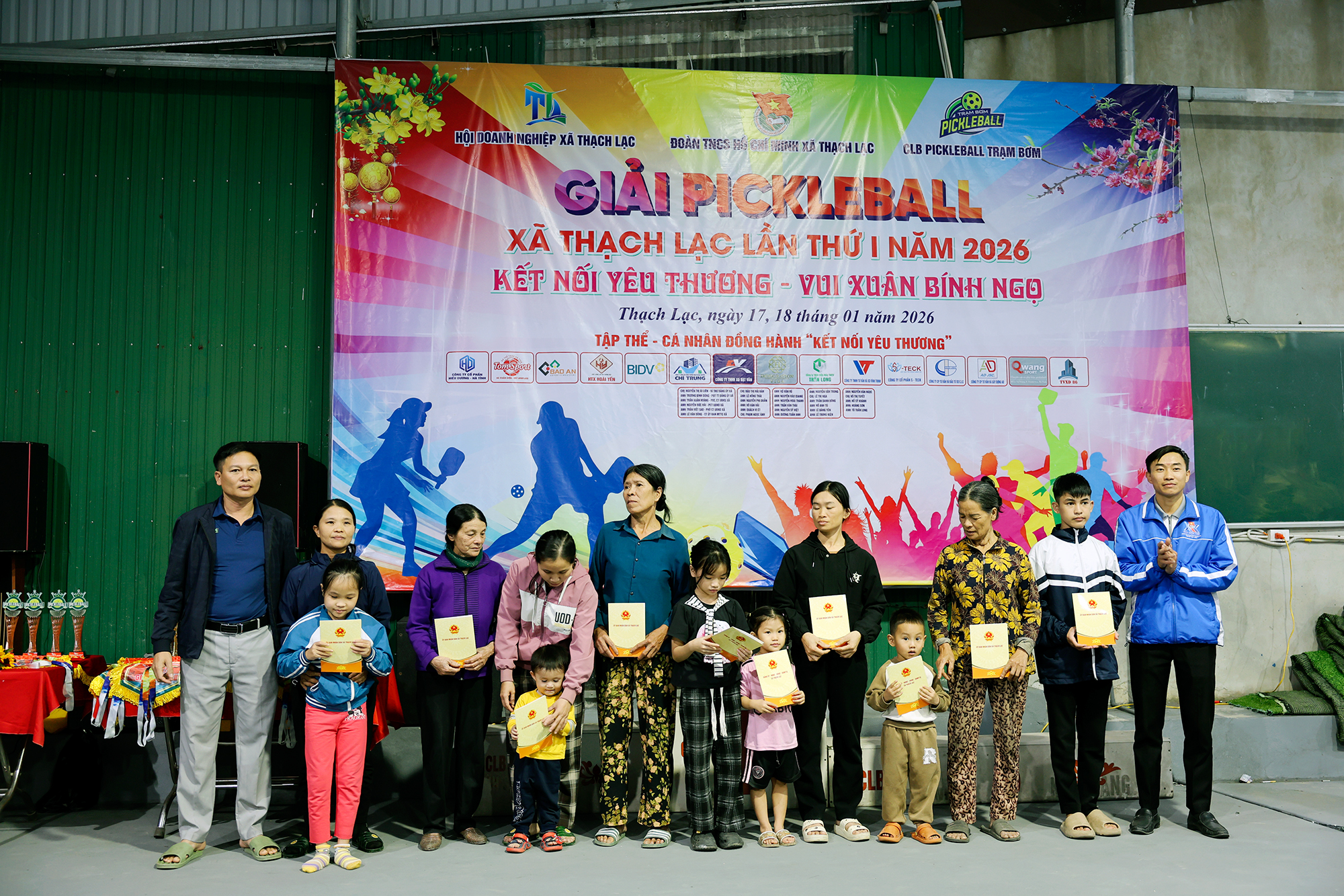 Nhân dịp này, Ban Tổ chức Giải Pickleball xã Thạch Lạc, gồm Hội Doanh nghiệp, Đoàn Thanh niên và Câu lạc bộ Trạm bơm xã, đã trao hỗ trợ 50 triệu đồng cho 100 suất quà an sinh xã hội, góp phần chăm lo Tết cho người nghèo thông qua Ủy ban MTTQ xã. Tại buổi lễ, Ban Tổ chức đã trao trực tiếp 19 suất quà cho các hộ nghèo, hộ cận nghèo trên địa bàn xã Thạch Lạc.