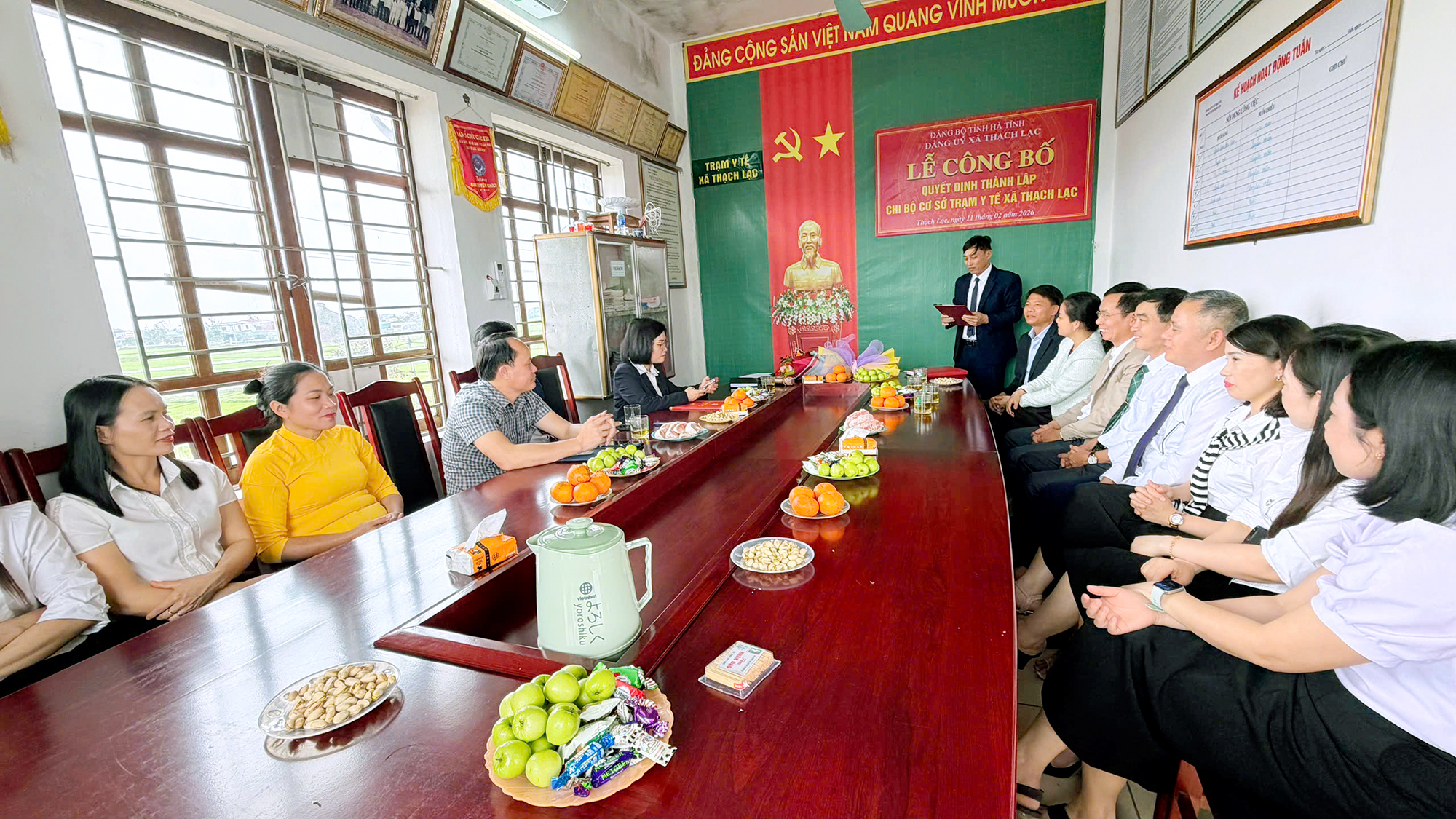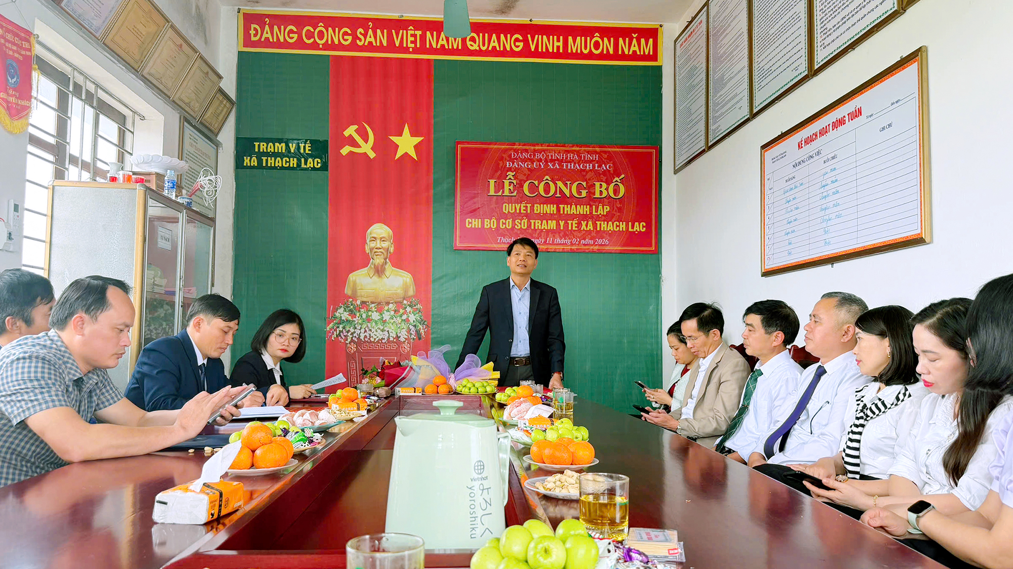 Chi bộ cơ sở Trạm Y tế xã Thạch Lạc được thành lập trên cơ sở sáp nhập các tổ chức Đảng của Trạm Y tế Thạch Lạc, Trạm Y tế Thạch Thắng và Trạm Y tế Tượng Sơn. Sau khi kiện toàn, Trạm Y tế xã Thạch Lạc có 24 viên chức; Chi bộ có 16 đảng viên, đồng chí Hoàng Trọng Hiếu – Phụ trách Trạm Y tế xã Thạch Lạc – được chỉ định phụ trách Chi bộ, bảo đảm điều kiện lãnh đạo toàn diện nhiệm vụ chính trị và chuyên môn của đơn vị. Phù hợp với yêu cầu nhiệm vụ khi Trạm được chuyển về trực thuộc cấp xã.